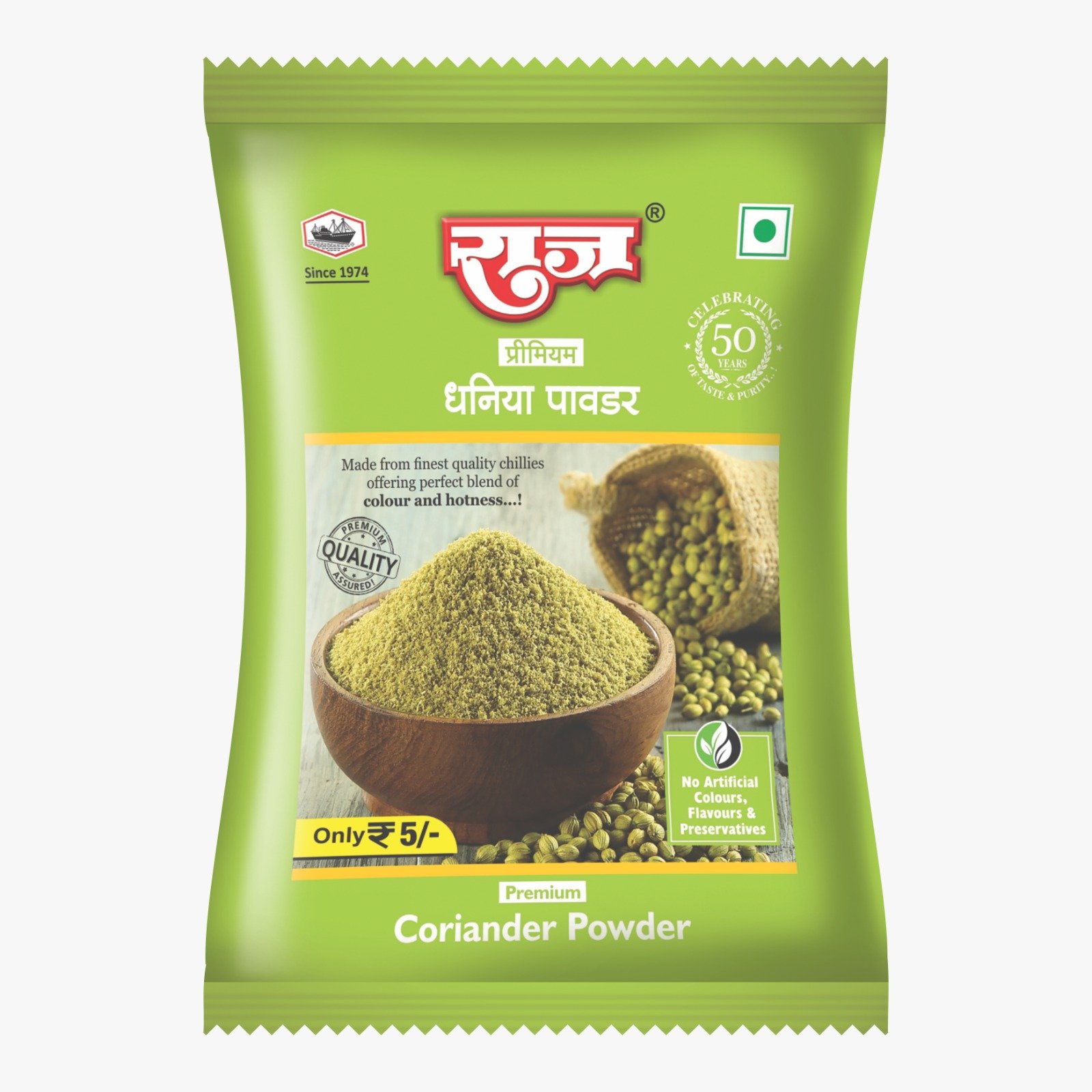 - Description: Our premium RaJ Dhaniya Powder (Coriander Powder) is made from the finest sun-dried coriander seeds, ground to a perfect texture to retain its natural aroma and earthy flavor. An essential ingredient in virtually all Indian curries, gravies, and vegetable preparations, it acts as a base flavor and a gentle thickening agent.